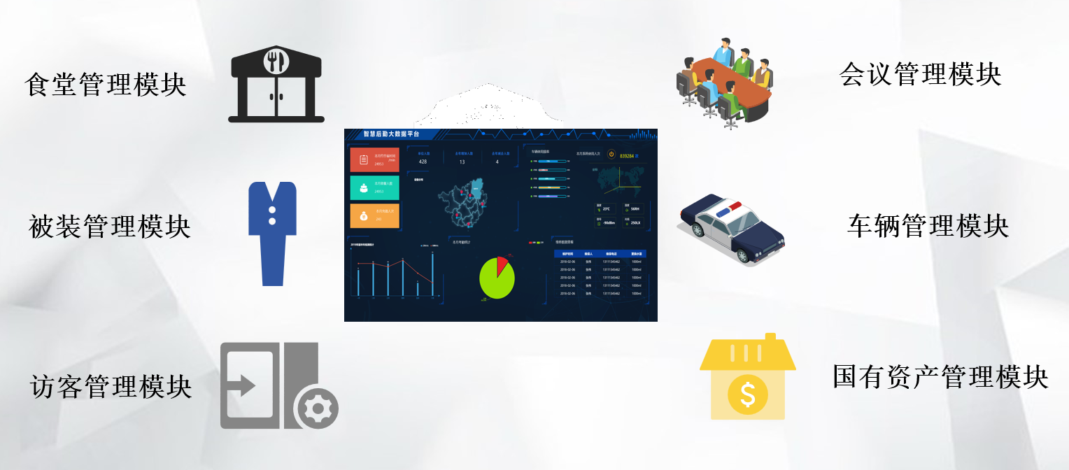 智慧警保管理系统实现:固定资产;被装;来访;会议;食堂;车辆等业务模块实现智能、信息化管理,解决领导管理上的麻烦,实现科技强警、信息化达标。